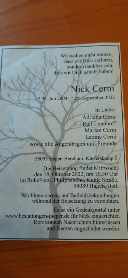 wir waren erschrocken und sehr traurig als wir vom Tod eures geliebten Sohnes erfahren haben.